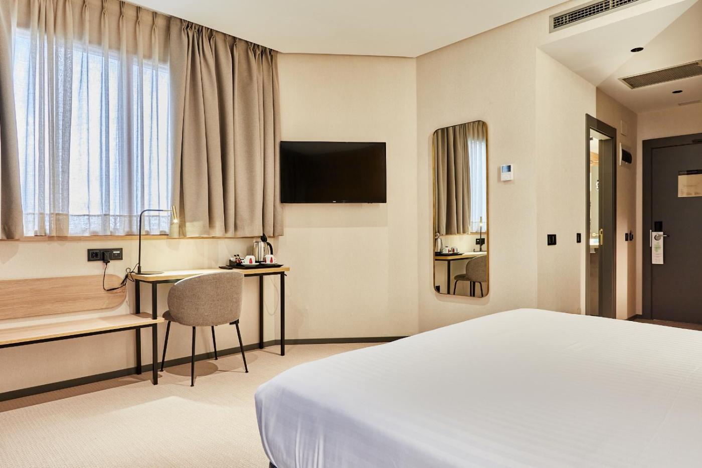 Habitación Doble Deluxe Club. Las habitaciones deluxe Silken Club se han renovado por completo. Son amplias y disponen de baño con luz natural y jacuzzi redondo. Estas amplias habitaciones se encuentran en la 5.ª planta. Cuentan con 1 cama doble (1,80 × 2 metros), edredón con los mejores tejidos, suelo innovador de vinilo entretejido, escritorio, puerto de carga USBUSB-C, minibar, caja fuerte, teléfono, TV y baño con ducha. El servicio CLUB ofrece ventajas como registro de salida después de lo habitual o registro de entrada antes de lo habitual (sujetos a disponibilidad),de café, todos los artículos de aseo Silken y comodidades VIP (albornoz y zapatillas).