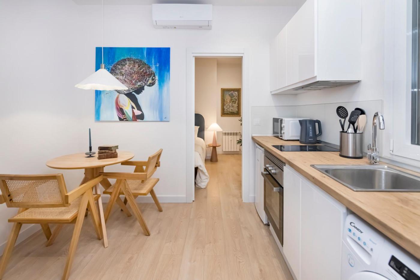 Apartamento de 1 dormitorio. Este apartamento ofrece entrada privada, aire acondicionado, cocina, 1 dormitorio y 1 baño con ducha y secador de pelo. La cocina está bien equipada con fogones, nevera, lavavajillas y utensilios. El apartamento incluye lavadora, paredes insonorizadas, teteracafetera, zona de estar y TV de pantalla plana. Tiene 1 cama.