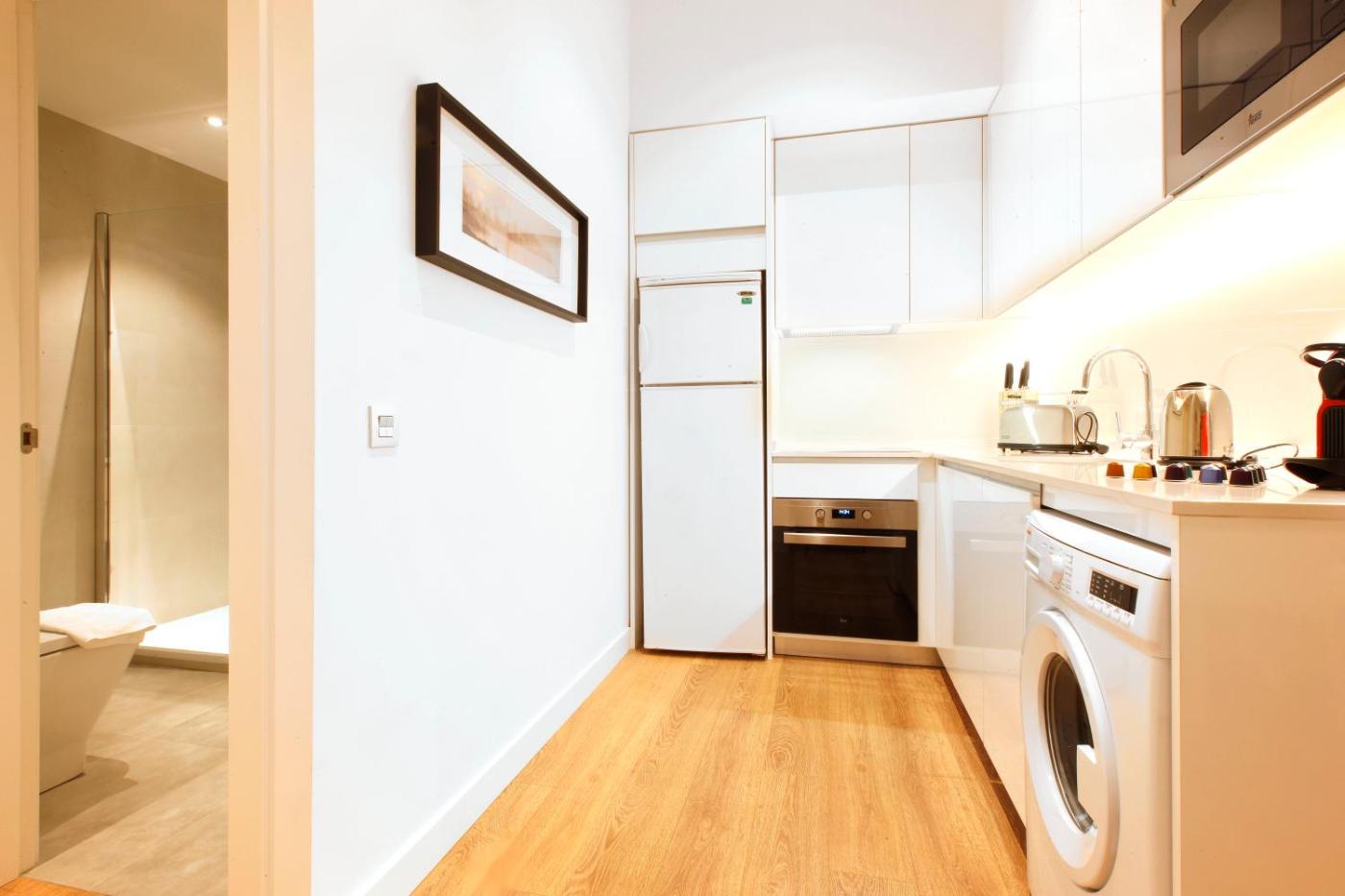 Apartamento Superior. El apartamento es amplio y dispone de sala de estar, 1 dormitorio independiente y baño con ducha a ras de suelo y artículos de aseo gratuitos. La cocina está bien equipada con fogones, nevera, lavavajillas y utensilios de cocina. El apartamento dispone de aire acondicionado, lavadora, teteracafetera, zona de comedor, armario y zona de estar con TV de pantalla plana. Incluye 2 camas.