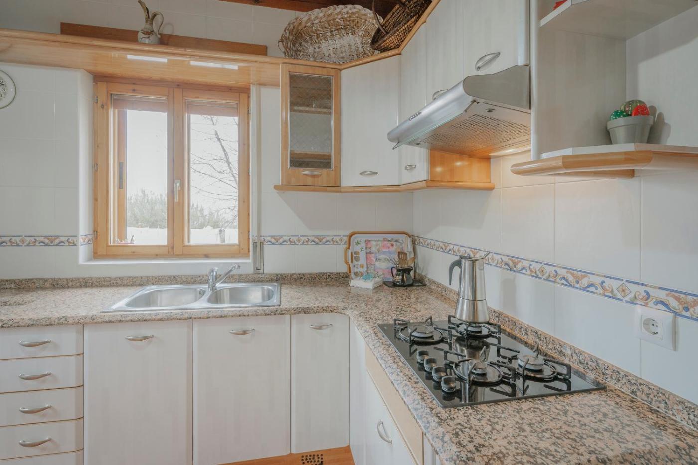La casa rural tiene 5 dormitorios, 5 baños, ropa de cama, toallas, TV, cocina totalmente equipada y patio con vistas a la montaña.